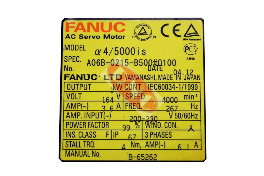 Fanuc A06B-0215-B500#0100 AC servo motor. Part of the 200VAC ALPHA i series model a4/5000iS with electrical rating off: 4Nm TRQ, 3.6A, 164V at 267Hz with maximum speed of 4000 rpm. Physically the motor is flange mounted with a straight keyed shaft 24VDC brake and IP67 rated seals. Further this motor has a IP67 rated 1million pulse aA1000 absolute encoder.