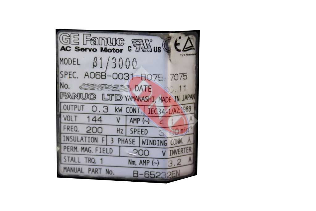 Fanuc A06B-0031-B075 BETA Model B1/3000 Servo Motor. This motor series stats are the following: 0.3kW, 3 phase 144V @ 200Hz, 3.2A, Max 3000 RPM. This motor has a straight shaft with no brake or key and standard shaft seal. Of this generation the 0031 BETA series red cap Model B1/3000 motor was fitted on small to medium sized machine tool.
