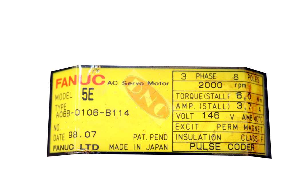 DNC offer A06B0106B114 fully refurbished motors with warranty on an exchange basis (assuming in stock). Testing, fault diagnosis, rebuild and repair of these model 5E is possible, including encoder, bearings, new seals, etc.
