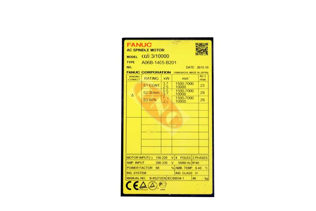 Fanuc A06B-1405-B201 model a3/1000i spindle motor. This series of motor is rated at: CONT. 3.7 / 2.5 KW, S2 5.5kW / 3./7kW; 3 phase, 1500 – 6000 rpm, with a straight shaft, rear exhausting fan and is foot mounted on the machine tool.