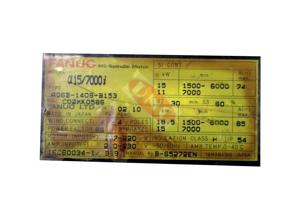 Fanuc A06B-1409-B153 spindle motor. This ai15/7000 series of motor is rated at: CONT. 15 / 11 KW, S2 18.5kW / 15 kW; 3 phase, 1500 – 7000 rpm. Flange mounted with a straight shaft (no key) and exhausting fan.